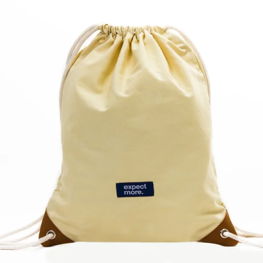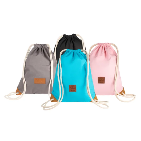 Trendige Tasche aus Baumwolle 225 g/m² (8 ozs), Kordelzüge dienen gleichzeitig als Umhängegurte, untere Enden mit Metallösen und Kunstlederecken verstärkt, Mindestbestellmenge 250 Stück