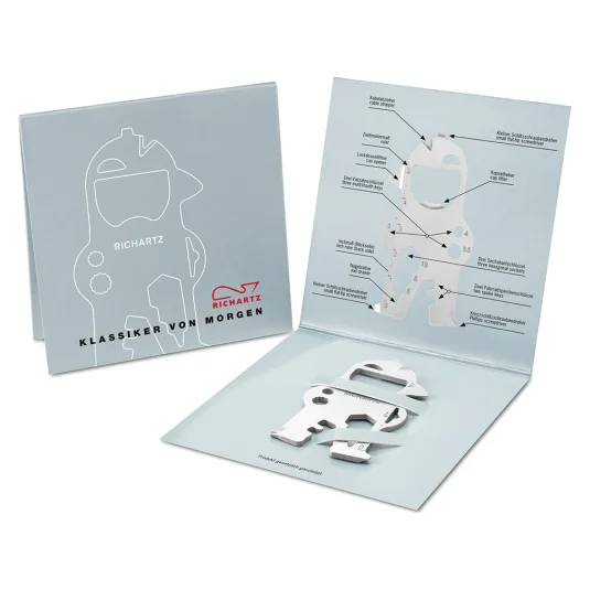 Sympathisches Multifunktionstool aus hochwertigem, matt gestrahltem Edelstahl, mit 17 praktischen Funktionen; Kapselheber, zwei kleine Schlitzschraubendreher, Kreuzschraubendreher, Kabelabzieher, zwei Fahrradspeichenschlüssel, drei Sechskantschlüssel, drei Vielzahnschlüssel, Zentimetermass, Inchmass, Lackdosenöffner, Nagelzieher