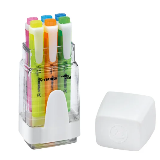 Set bestehend aus 6 flachen Textmarkern mit praktischem Clip als Taschenmodell, wahlweise 2 verschiedene Strichstärken (1 oder 4 mm) erhältlich für verschiedene Markierungsarten, geliefert in transparenter Box