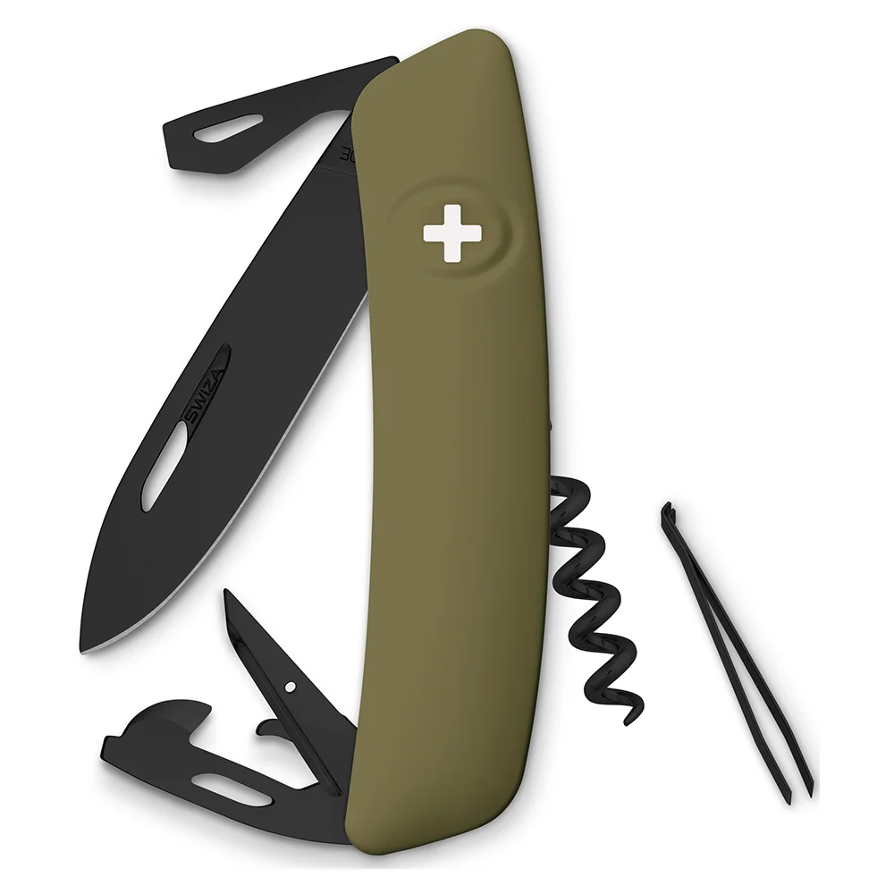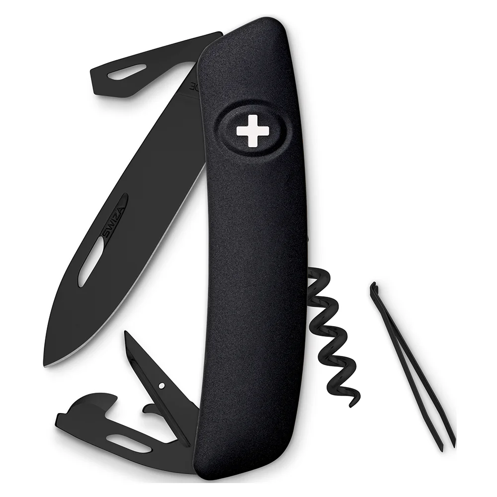 Swiss Made, in edlem Design - mit extra starker Klinge (75mm) aus rostfreiem Edelstahl (440/ 57 HRC) mit einer hoch widerstandsfähigen, tiefschwarzen Hightech-Beschichtung sowie angenehmer, robuster Soft Touch (Anti-Rutsch) Oberfläche - präsentiert sich dieses Kultobjekt Funktionen: Messer, Stech- und Bohrahle, Nähahle, Flaschenöffner, Drahtbieger, Dosenöffner, Schlitzschraubendreher Nr.