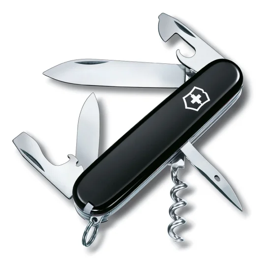 Einer der Bestseller von Victorinox! Aus hochwertigem, rostfreiem Stahl mit 12 Funktionen: grosse Klinge, kleine Klinge, Dosenöffner mit kleinem Schraubendreher, Korkenzieher, Stech-Bohr-Nähahle, Zahnstocher, Pinzette, Kapselheber mit Schraubendreher, Drahtabisolierer und Ring (Anhänger)