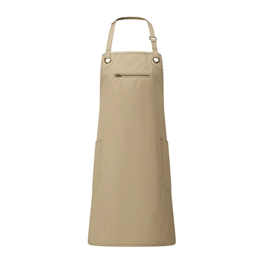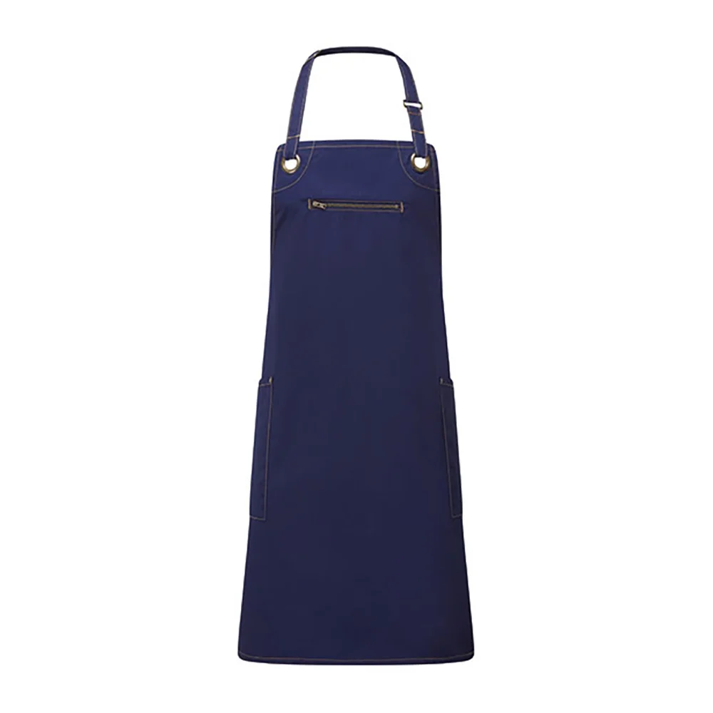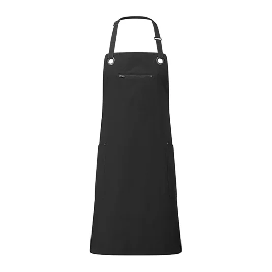 Nachhaltige Latzschürze mit kontrastfarbenem Einsatz und verstellbarem Band am Nacken. Mit zwei abgeschrägten Fronttaschen. Hergestellt aus Recyceltem Polyester aus Altkunststoff und Baumwolle.