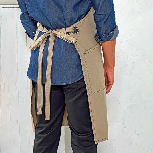Nachhaltige Latzschürze mit kontrastfarbenem Einsatz und verstellbarem Band am Nacken.