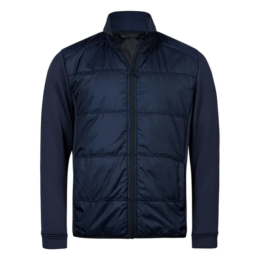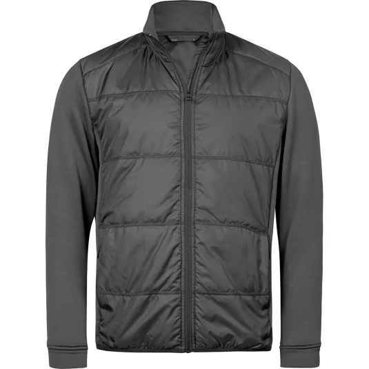 Hochwertige, leicht tailliert geschnittene Herren Hybridjacke mit gestepptem Körperteil. Die moderne Herrenjacke hat elastische Seiteneinsätze und Ärmel, zwei versteckte Fronttaschen mit Reissverschluss, eine Innentasche, ein elastisches Formband am unteren Saum, einem Stehkragen sowie SBS-Reissverschlüsse.