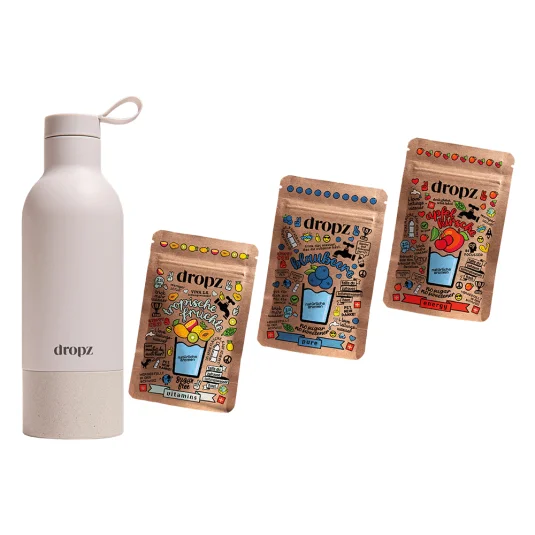 In der Schweiz entwickelt! Set bestehend aus einer Trinkflasche und 3 Packungen (à 20 Stück) dropz