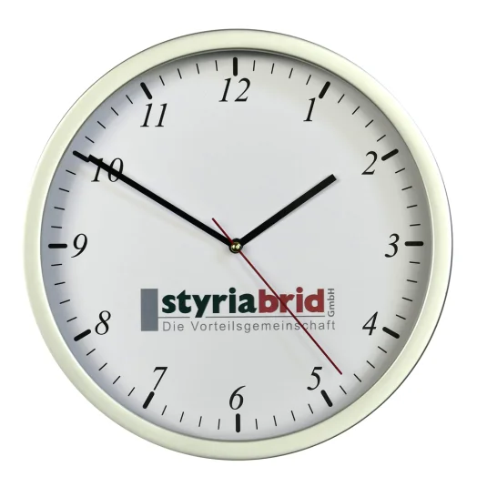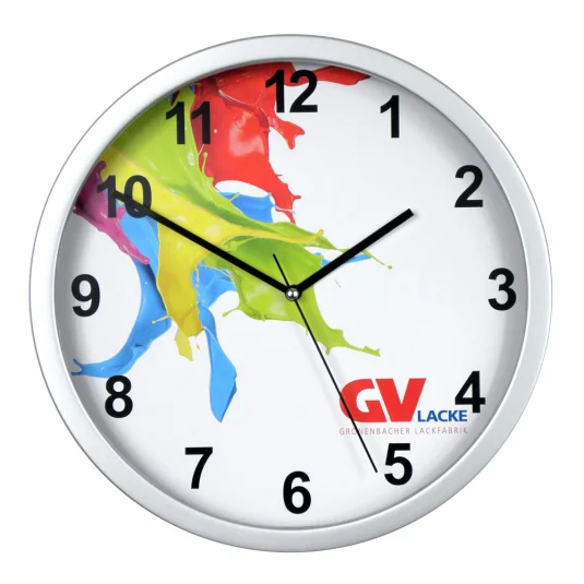 Dekorative Wanduhr aus Kunststoff und Mineralglas, Ziffernblatt im Eigendesign