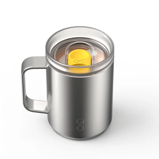 Stop Ocean Plastic! Doppelwandiger, vakuumisolierter Travel Mug aus 90% rezykliertem Edelstahl, hält Getränke bis zu 4 Stunden warm oder bis zu 10 Stunden kühl, mit ergonomischem Griff und abnehmbarem Deckel aus rezykliertem Kunststoff (67 %) mit Schiebeverschluss, Inhalt 0,35 l