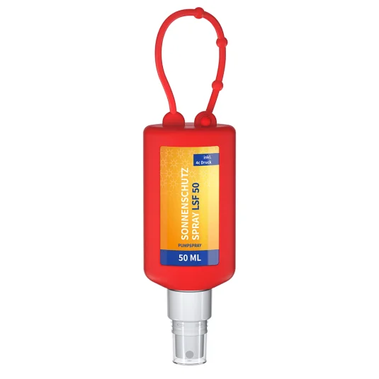 Korallenschonender Sonnenschutz - hergestellt in Deutschland! Praktischer kleiner Bumper zum Anhängen, aus 100% rezykliertem PET, befüllt mit extra wasserfestem, transparentem, schnelleinziehendem und sofortschützendem Sonnenspray mit hohem Schutzniveau (LSF50) mit UVA/UVB Breitbandfilter und wertvollem Vitamin E, Haltbarkeit 3 Jahre (6 Monate nach Anbruch), Inhalt 50 ml
