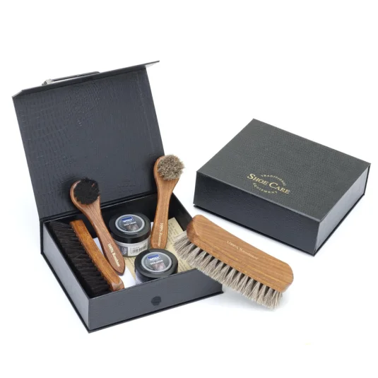 Hochwertiges Komplett-Set bestehend aus 2 Glanzbürsten, 2 Crèmebürsten, 2 Schuhcrèmes (schwarz und neutral) und 1 Poliertuch, wird in praktischer Box mit Klettverschluss geliefert
