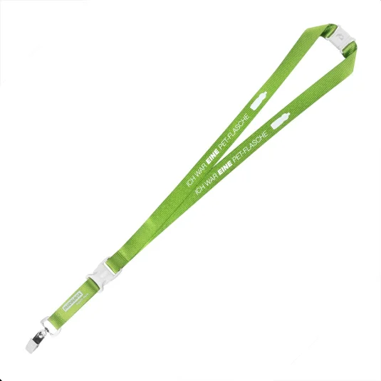 Umweltfreundlicher Badgeholder aus rezykliertem Polyester (post-consumer recycled polyester), mit Sicherheitsclip im Nacken, mit Verbindungsclip, Bandbreite wählbar (10-25 mm breit), mit Karabinerhaken, Schlüsselring oder Handyschlaufe, Design und Ausführung nach Wunsch, Mindestbestellmenge 250 Stück
