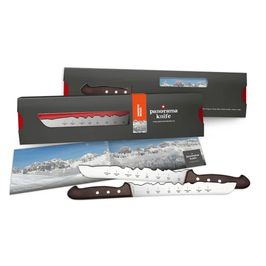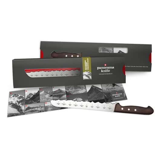 Swiss Made - Brotmesser aus rostfreiem, gehärtetem Klingenstahl mit Griff aus Palisander-Holz oder Polypropylen-Kunststoff, mit Klinge in Form der Schweizer Berge (z.