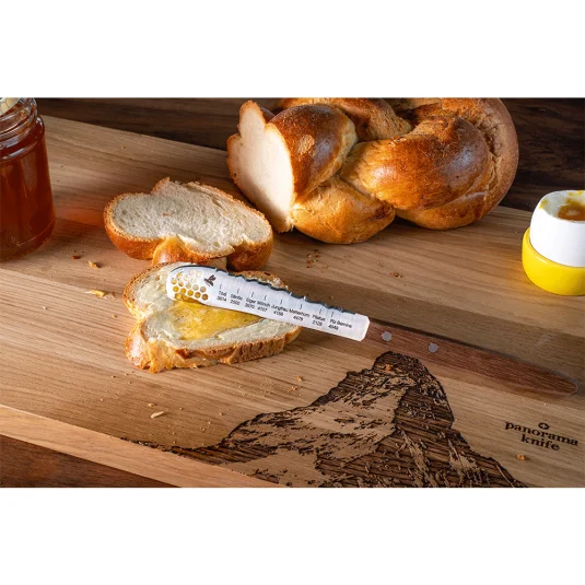 Swiss Made - Multifunktionales Frühstücksmesser aus hochwertigem Stahl mit "Best of Switzerland"-Panorama (mit Tödi, Säntis, Eiger, Mönch, Jungfrau, Matterhorn, Pilatus, Piz Bernina) und einem edlen Griff aus Nussbaumholz, perfekt zum Schneiden der Brötchen, für den Aufstrich von Butter und Marmelade sowie ideal für Honig
