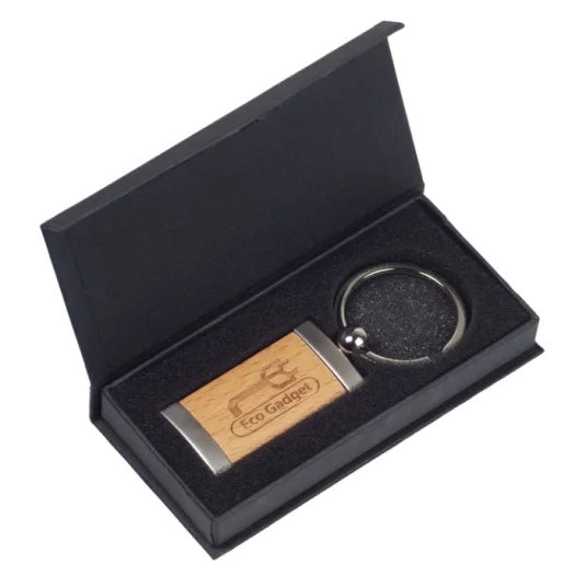 Hochwertiger Schlüsselanhänger aus gebürstetem Stahl und Ahornholz, optional auch in dekorativer Geschenkbox mit Magnetverschluss erhältlich (Preise auf Anfrage)