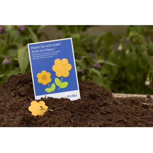 Löst sich - in einen Blumentopf gelegt - umgehend in Blumen auf! Nachhaltiges Papier aus Saatgut, in gestanzter, individueller Form, angebracht an eine Postkarte im Eigendesign