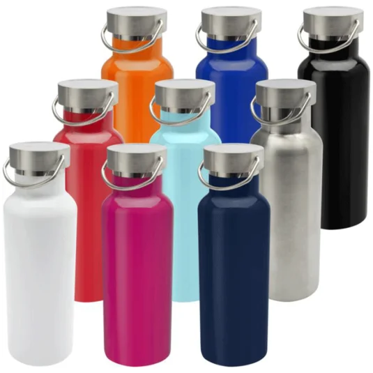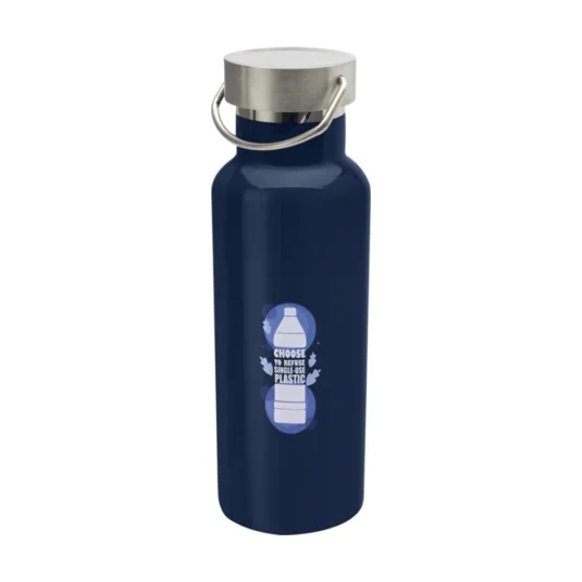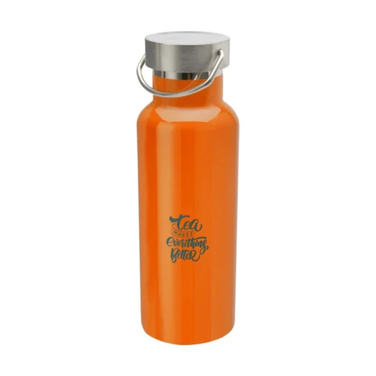 Robuste, doppelwandige und vakuumisolierte Trinkflasche aus rezykliertem Edelstahl, mit Schraubverschluss und praktischem Bügel, Inhalt 0,5 l