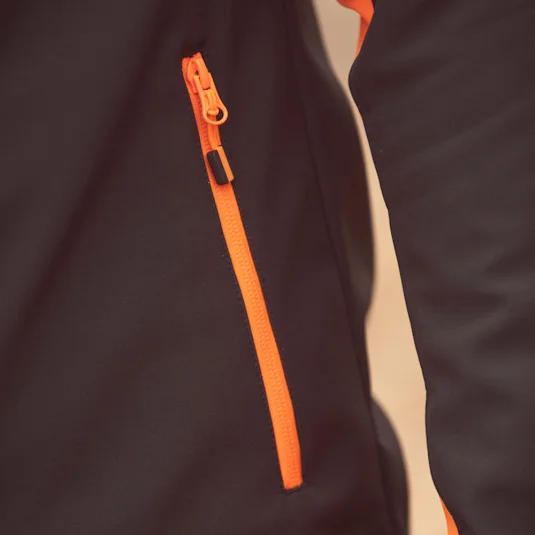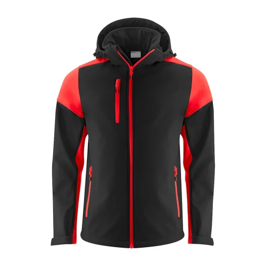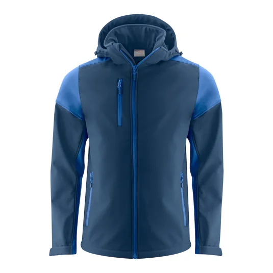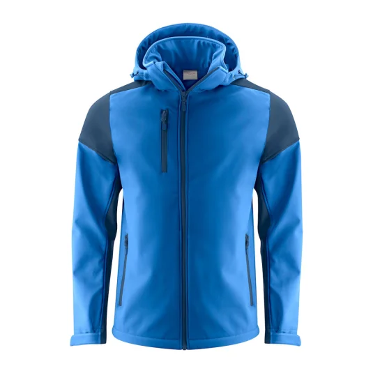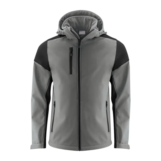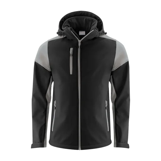 Zweifarbige Softshell Jacke mit abnehmbarer Kapuze.