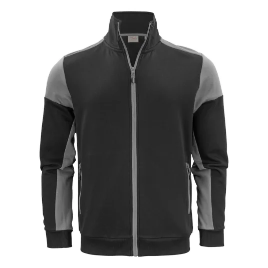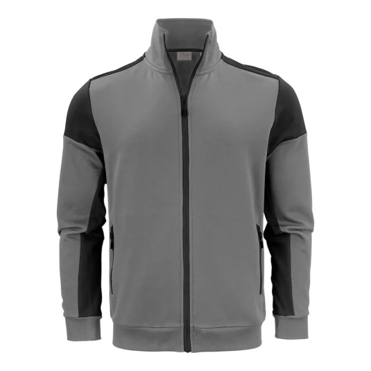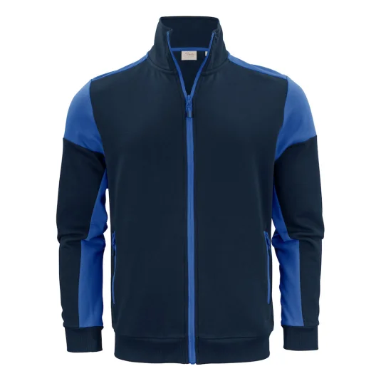 Zweifarbige Sweatjacke mit Stehkragen und durchgehendem, kontrastfarbigem Reissverschluss vorne und an den Seitentaschen.