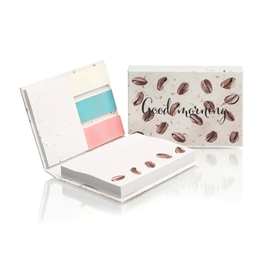 Umweltfreundliches Set im Hardcover-Umschlag mit Einband aus rezykliertem Papier (120g/m2) mit nachhaltigem Zusatz von Kaffeesatzabfällen, Haftnotizen aus rezykliertem Papier (80g/m2) à 100/50 Blatt, sowie Haftmarker in drei verschiedenen Farben (70g/m2) à 25 Blatt