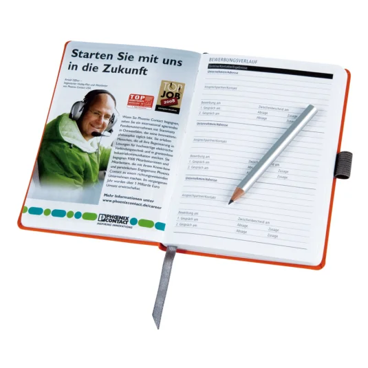 Trendiges Notizbuch mit Bucheinbandstoff - individuell zusammengestellt nach Ihren Firmenfarben: Umschlagfarbe, Veredelung, Lineaturen, Farbschnitte, Lesezeichen, Gummizug, Stiftschlaufe, blanko, liniert, kariert oder punktiert möglich, Inhalt 192 Blatt