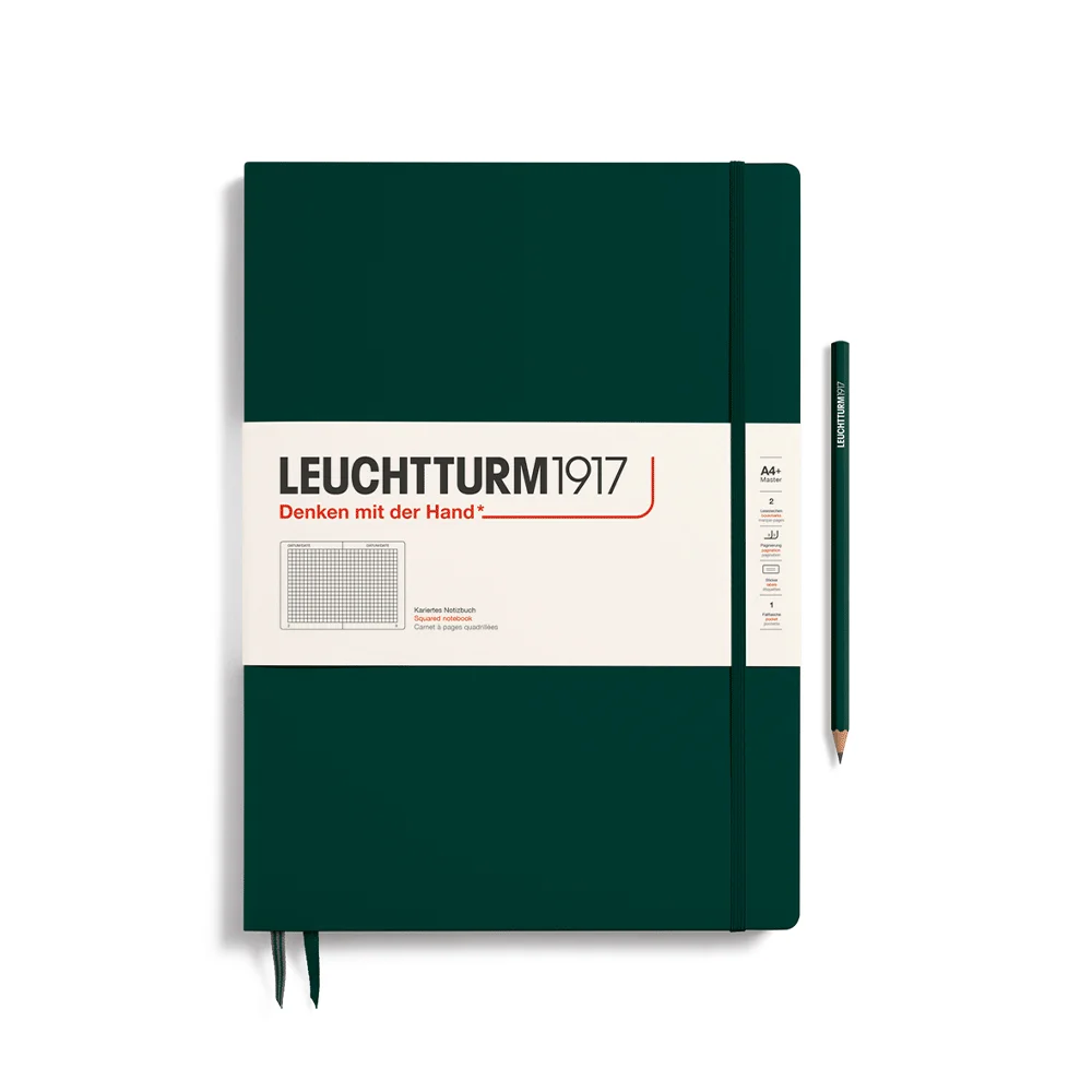 Schlankes Notizbuch Master Slim im Format DIN A4+, mit hoher Papierqualität (100g/m2), dreiseitigem, tabellarischem Blanko-Inhaltsverzeichnis, 123 numerierten Seiten, 8 heraustrennbaren Blättern, Falttasche und Verschlussgummi, auf Wunsch mit verstärkter Stiftschlaufe erhältlich (Preis auf Anfrage)