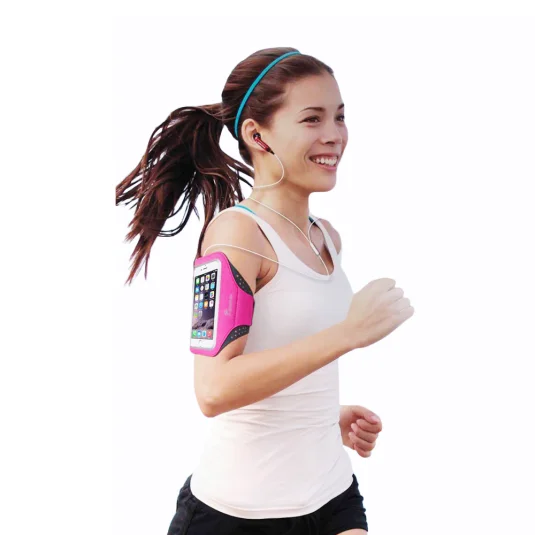 Professionelles Armband für alle Sportler, die unterwegs nicht aufs Handy verzichten wollen, aus dehnbarem Lycra-Material, mit transparentem Fenster, erlaubt Handybedienung ohne Herausnehmen, Reflektorstreifen und Fach für Schlüssel, Mindestbestellmenge 250 Stück