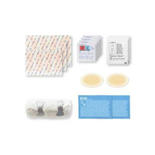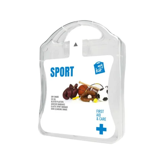 Praktische, kleine Notfall-Box aus gefrostetem Kunststoff, befüllt mit 12 wasserfeste Pflaster, 4 hautreinigende Tupfer, 2 Trockentupfer, 2 Eisgel, 2 Blasenpflaster, 1 elastischer Sportverband
