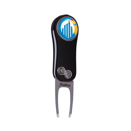 Leichte, automatisch klappbare Pitchgabel aus hochwertigem Kunststoff, inklusive magnetischem Golfballmarker mit Doming im Eigendesign