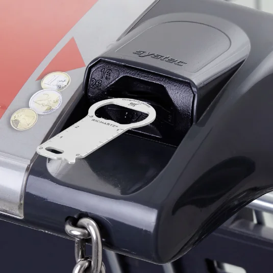 Einkaufswagenlöser für den Schlüsselbund aus rostfreiem Edelstahl, mit weiteren praktischen Funktionen; Flaschenöffner, Zentimetermass und Schraubendreher