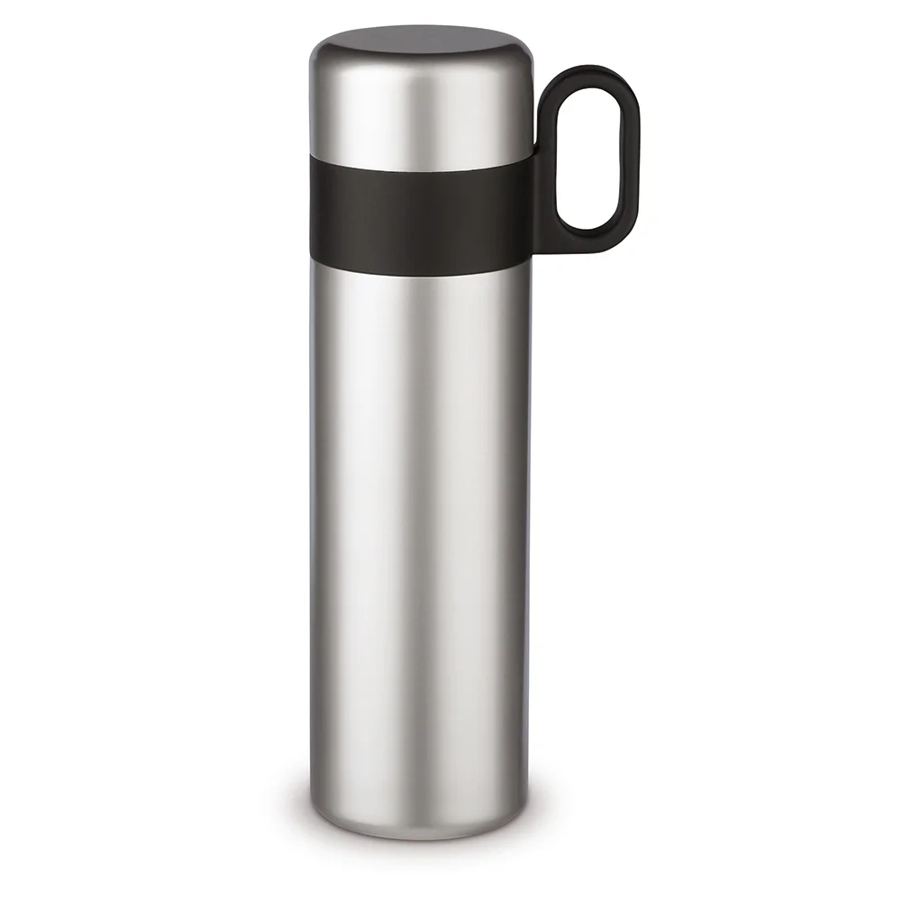 Doppelwandige Isolierflasche mit Becher, der gleichzeitig als Verschluss dient, Innen- und Aussenseite aus Edelstahl