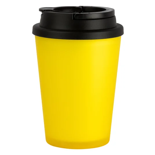 Doppelwandiger Isolierbecher aus Kunststoff (BPA-frei), in matt-transparenter Optik, mit schwarzem Schraubdeckel, auslaufsicherem Trinkverschluss sowie praktischem Henkel, Inhalt 0,35 l, Mindestbestellmenge 500 Stück