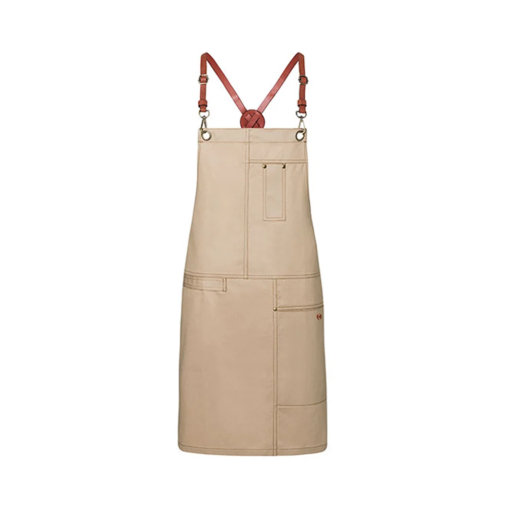 Stylisch-trendige Latzschürze in Twill-Optik mit Kreuzträgern zur Entlastung des Nackens. Einfaches Abnehmen und Befestigen aller Bänder mithilfe von Karabinerverschlüssen. Schnallen zum stufenlosen Einstellen der Länge. Zusätzliches Taillenband zum Regulieren der Weite garantiert einen festen Sitz. Bronzierte Nieten und kontrastfarbige Steppnähte sorgen für einen unverwechselbaren Urban-Style. Funktionale Bänder aus Echtleder, praktische Stoffschlaufe auf der rechten Seite zum Befestigen eines Kassierhalfters oder Geschirrtuchs, linksseitige Tasche (16 x 24 cm) und Stiftfach auf Brusthöhe.