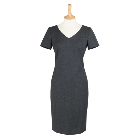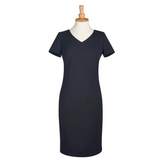 Elegantes Kleid mit V-Ausschnitt, kurzen Ärmeln, Rückenschlitz, Stretch Futterstoff, maschinell waschbar und knitterarm.