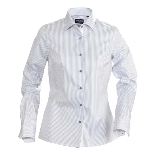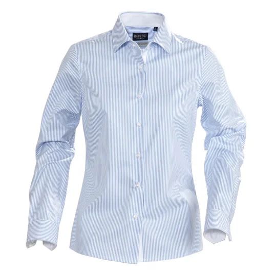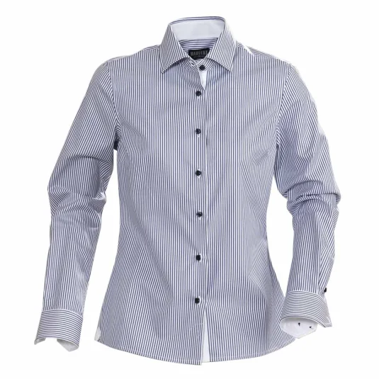 Klassische Bluse aus gekämmter Baumwolle mit Easy-Care-Behandlung. Nähte, Kragen und Ärmel sind verstärkt. Streifenmuster mit Kontrastfarbe und dem Kragen, an der Knopfleiste und am Ärmel. Für die Damen mit taillierter Passform.