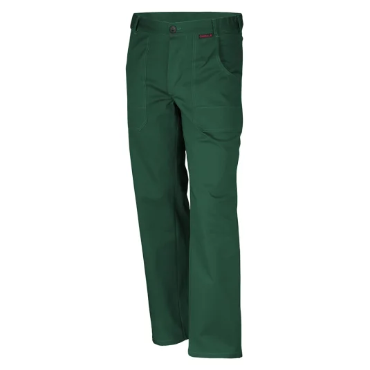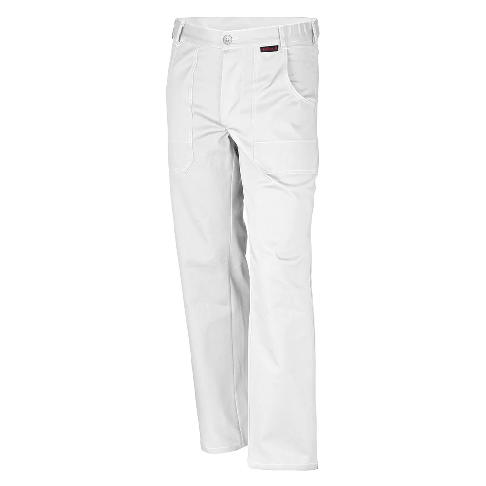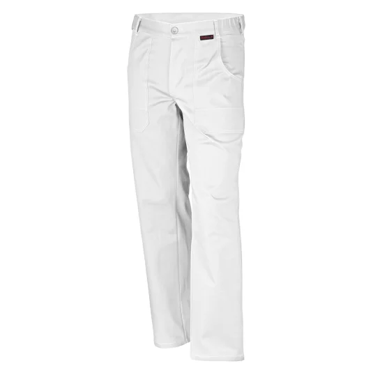 Bundhose mit 7 Gurtschlaufen, seitlich im Bund eingearbeitetem Gummizug, 2 aufgesetzten Vordertaschen, 1 verstärkten Gesässtasche mit Patte, verschliessbar mit verdecktem Klettverschluss, doppelte Massstabtasche, Hosenschlitz geknöpft, weisse Hosen mit Knietaschen verfügbar.