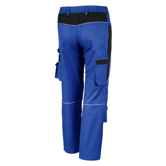 Bundhose mit 6 Gurtschlaufen, seitlich im Bund eingearbeitetem Gummizug, 2 aufgesetzten Vordertaschen, 2 verstärkten Gesässtaschen, verschliessbar mit Klettverschluss, einer Massstabtasche, einer eingearbeiteter Leistentasche, einer Hammerschlaufe, Reflexpaspeln, vorgeformeten Knie und Knietaschen mit Klettverschluss, elatischem Stretcheinsatz unter der Knietasche, Hosenschlitz mit YKK-Metallreissverschluss.