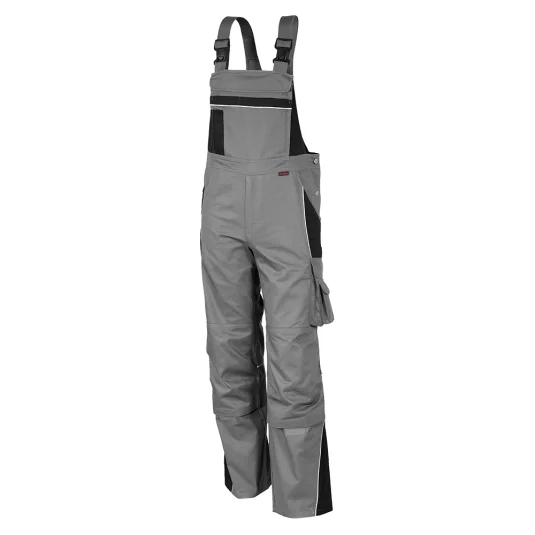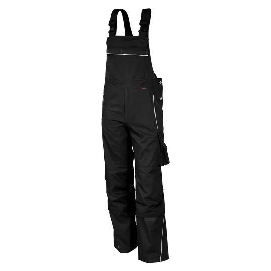 Latzhose mit Reflexpaspeln, Hosen mit YKK Metallreissverschluss, Vorgeformte Knie und Knietaschen mit Klettverschluss, elatischer Stretcheinsatz unter Knietasche, Brustlatz mit aufgesetzten Latztaschen, 2 eingesetzte Vordertaschen, eingearbeitete Leistentasche, 1 Oberschenkeltasche, 2 Gesässtaschen, Hammerschlaufe.