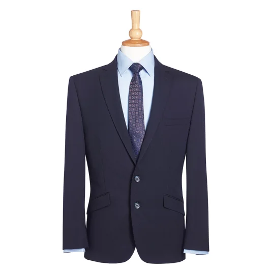 Schmal geschnittener Sakko mit einer Brustleistentasche, 2 Knöpfen in der vorderen Mitte, schmales Revers mit abgesteppter Naht, zwei seitliche Schlitze im Rückenteil, maschinell waschbar und knitterarm.