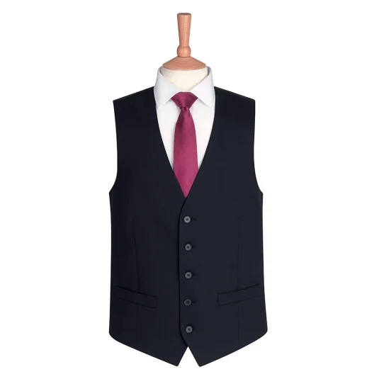 Weste mit 5 Knöpfen in der vorderen Mitte, zwei Leistentaschen, Satinrücken verstellbar, maschinell waschbar und knitterarm.