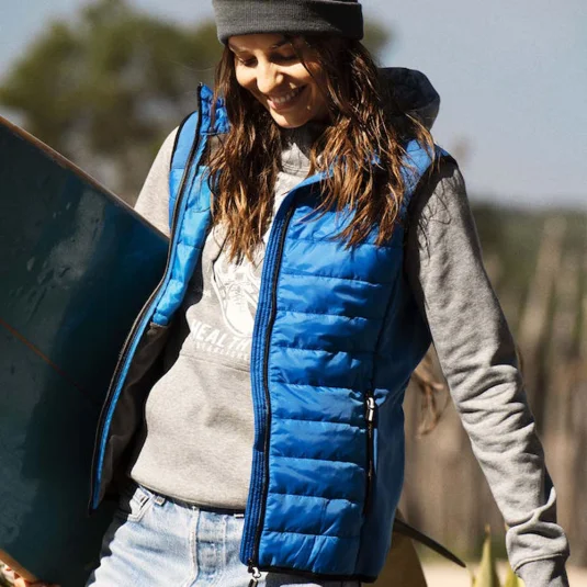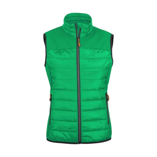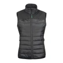 Wattiertes Gilet gesteppt und mit Sofshell Einsätzen über der Schulter und an den Seiten. Zwei Aussentaschen mit Reissverschluss, Innen zwei Beuteltaschen Meshgefüttert. Elastisches Band als Abschluss am Saum. Farbauswahl, Reissverschlüsse und Zipper Puller sind passend zu allen Essentials Artikel.