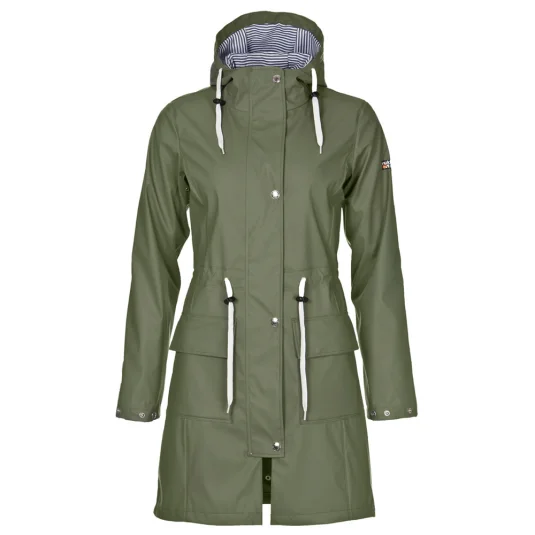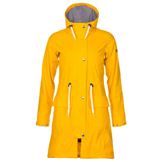 Klassische Regenjacke mit 2 Aussentaschen, abgedecktem Reissverschluss und fixer Kapuze.
