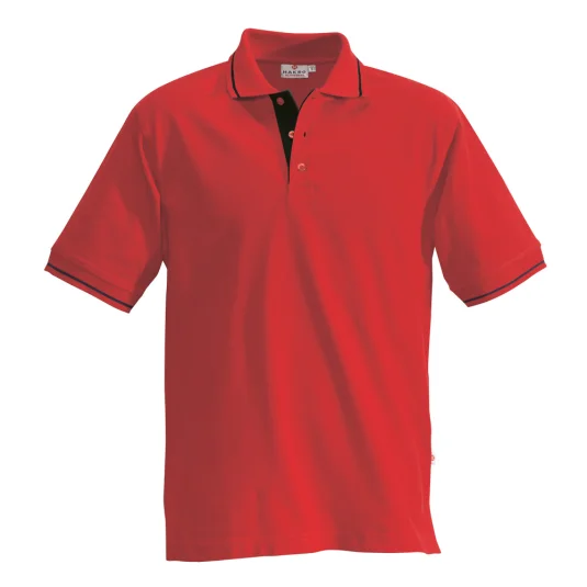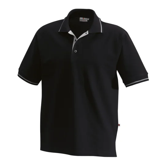 Hochwertiges Poloshirt, kontrastfarbig unterlegte Knopfleiste, Knöpfe "Ton in Ton", Nackenband, Seitenschlitze, Kontraststreifen im Polokragen und an den Armbündchen.