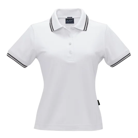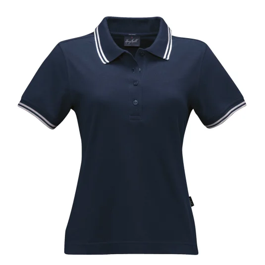 Damen Poloshirt aus feinmaschigem Baumwoll-Piqué mit schmalen Kontrastreifen, körperbetonte Schnittführung. Knopfleiste mit 4 "Ton in Ton" Knöpfen, Nackenband, Seitenschlitze. Zwei Kontrastreifen an Kragen und Ärmelbündchen.