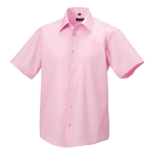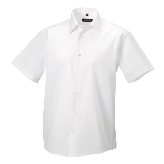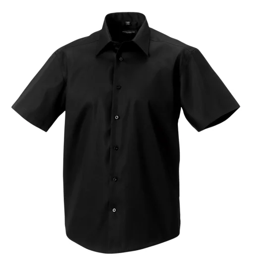 Körperbetontes kurzärmliges Herrenhemd aus bügelfreiem Stoff, halb ausgestellter stäbchenverstärkter Kragen, abgerundeter Bund