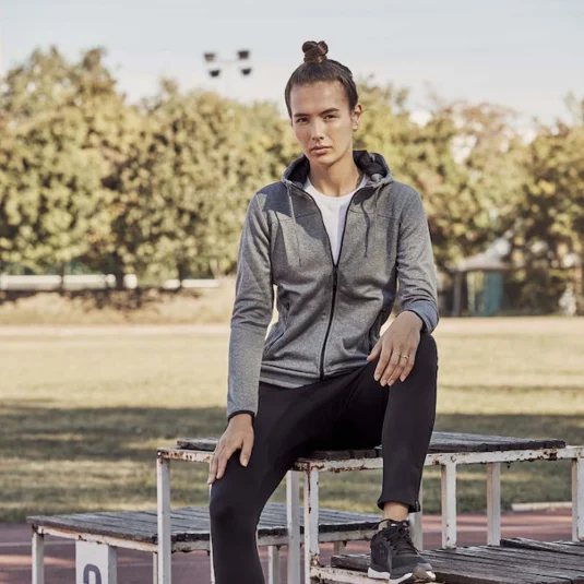 Eine schöne Kapuzenjacke aus weichem, elastischem und komfortablem Polyester.