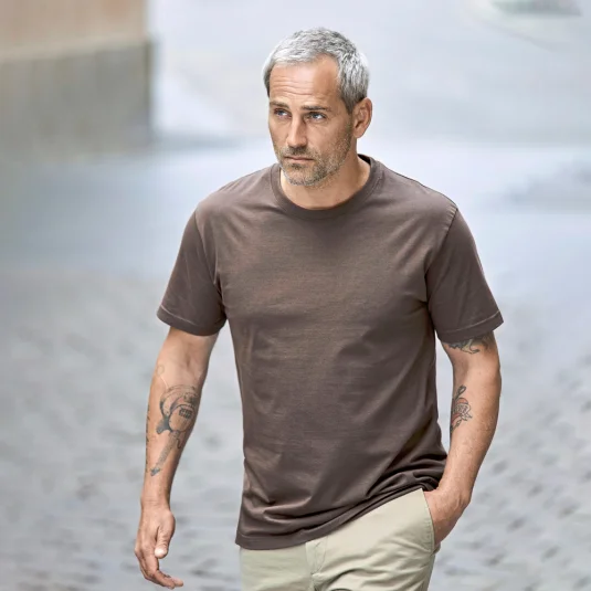 Klassisches Herren T-Shirt mit Rundhalsausschnitt, Schulter-zu-Schulter-Nackenband, 2-lagiges Halsbündchen mit Elastan, Schlauchware, vorgeschrumpft.