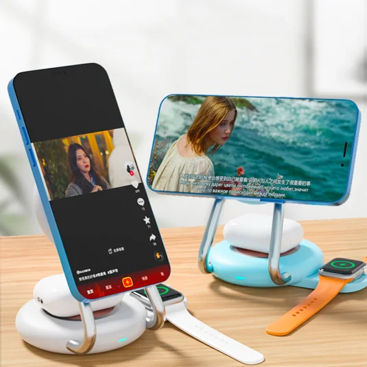 3in1-Ladegerät aus Kunststoff und Silikon, kompatibel mit allen QI-fähigen Geräten, enthält eine magnetische Ladestation für Smartphones, eine Ladestation für Kopfhörer und eine Ladestation für Apple Watch