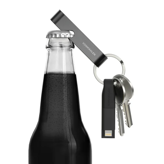 Innovatives, multifunktionelles USB-Schnellladekabel HIGH SIX® aus Edelstahl, Kunststoff und rezykliertem Kupfer, zum Aufladen von allen mobilen Endgeräten, der praktische Flaschenöffner dient gleichzeitig als Schutzhülle für das Kabel, mit Schlüsselbund-Ring