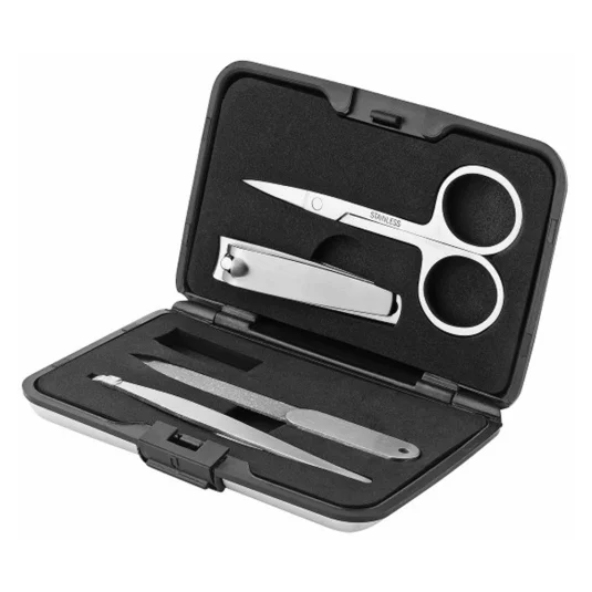 Eleganter Mini-Koffer aus Kunststoff, mit den wichtigsten Instrumenten aus Edelstahl für die tägliche Nagelpflege: Nagelschere, Nagelknipser, Saphirfeile und Pinzette
