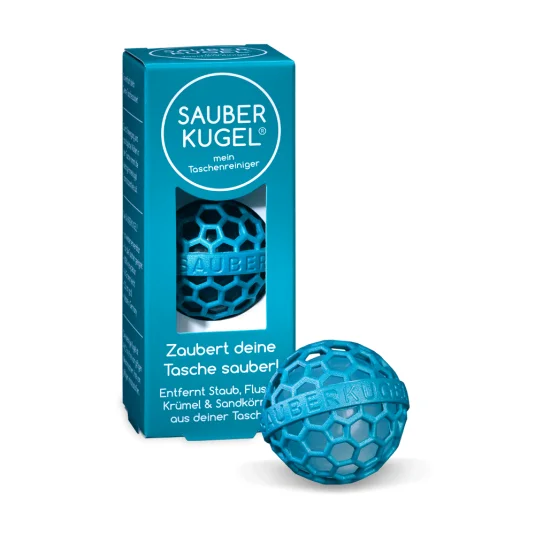 Zaubert jede Tasche sauber! Innovative, sehr leichte (16 g) und wiederverwendbare Kugel (Ø 3,5 cm), hergestellt in Europa, welche jede Handtasche, Rucksack oder Schulranzen von lästigen Schmutzpartikeln wie Krümel, Flusen, Staub oder Sand befreit, die klebende Innenkugel kann durch einen Klick herausgenommen und einfach gereinigt werden (Wasser/Spülmittel), kein Klebeverlust, Silikon- und PVC-frei, 100% rezyklierbar