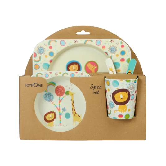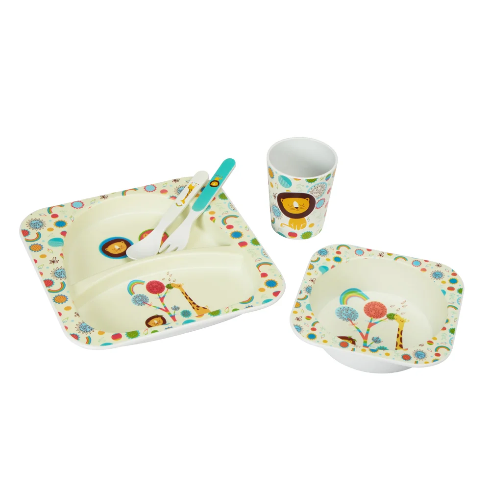 Nachhaltiges Kinder-Geschirrset hergestellt aus rPET (82 %) bestehend aus Teller, Schale, Becher, Gabel und Löffel, nach EU-Normen geprüft, mikrowellen- und spülmaschinenfest